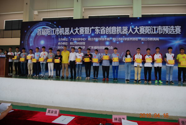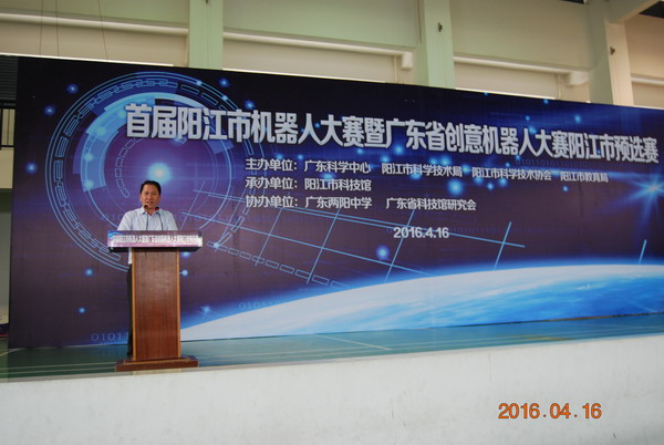 为推动阳江市机器人科学技术的普及,鼓励更多的青少年在电子、信息、自动控制等高新科技领域学习、探索和研究,激发青少年的科学兴趣,提高科学素质,并选拔优秀队伍参加广东省创意机器人大赛,4月16日,首届阳江市机器人大赛暨广东省创意机器人大赛阳江市预选赛在广东两阳中学举行。本次大赛由阳江市科学技术协会、阳江市科学技术局、 阳江市教育局、广东科学中心主办,阳江市科技馆承办,广东两阳中学、广东省科技馆研究会协办。