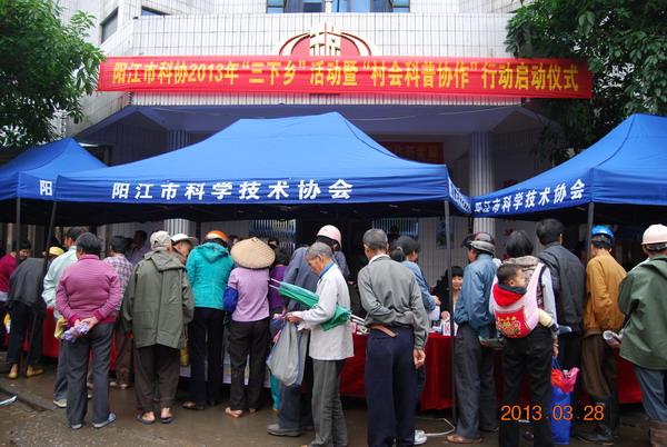 3月28日,阳江市科协、江城区科协联合市科工信局、市农学会、市气象学会、市医学会、江城区科工贸局、江城区农林局、江城区卫生局、江城区计生局等单位,在江城区白沙街道圩场共同启动了2013年文化科技卫生“三下乡”暨“村会科普协作”行动。