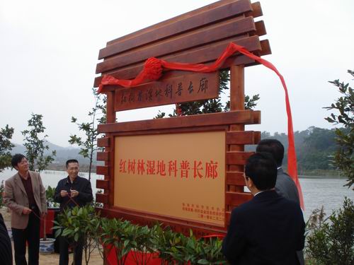 2月2日,由珠海市科协投资10万元,与珠海市市政园林局、珠海市淇澳担杆岛省级自然保护区共同兴建的红树林湿地科普长廊建成并投入使用。珠海市科协党组书记、主席肖润新为红树林湿地科普长廊揭幕。设计新颖、古色古香的红树林湿地科普长廊和美丽的淇澳岛红树林保护区环境协调融合,成为了保护区的一道美丽景观。红树林科普长廊图文并茂,通过红树林知识问答、红树林功能介绍、红树林生态系统、红树植物的抗旱代谢等展区,使市民关于“什么是红树林”、“红树林为什么不红”等疑惑一一解开。