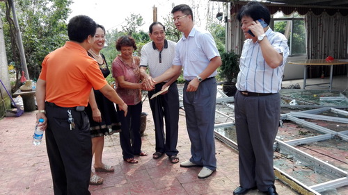 由于受今年第22号强台风“彩虹”影响,遂溪县各科普示范基地和农技协损失严重,仅是遂溪县花卉协会属下的会员受灾盆栽、绿化苗木面积就达4.13万亩,直接经济损失达2.065亿元。肖斌主席一行先后来到湛江市盆景教学基地、遂溪县花卉协会、遂溪县盆景根艺雅石协会实地察看受灾情况。每到一处,肖斌都认真听取企业负责人对灾情的汇报,还亲自查看被台风吹倒的房屋、铁棚和花卉苗木的情况,并鼓励他们要树立渡过难关的信心,在县委县政府和有关部门的帮助和指导下,迅速开展生产自救,减少损失。同时向有关企业送上了慰问金。肖斌要求,基层科协要与有关部门密切配合,细致核查灾情,要尽快将灾情统计上报,扎实做好灾后重建工作;要加强技术指导,帮助农户恢复生产信心;要求大家再接再厉、团结一致,尽快恢复灾后工作生活秩序。