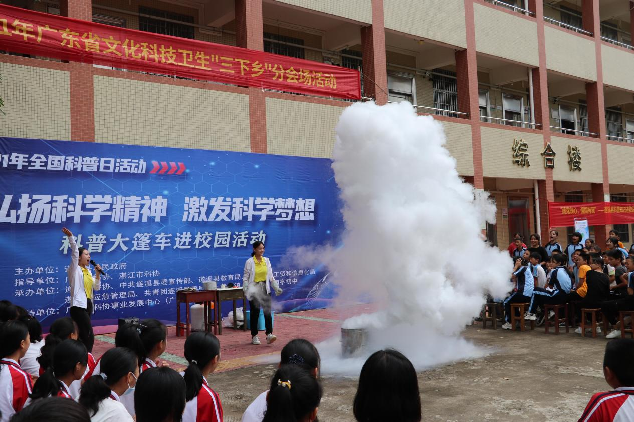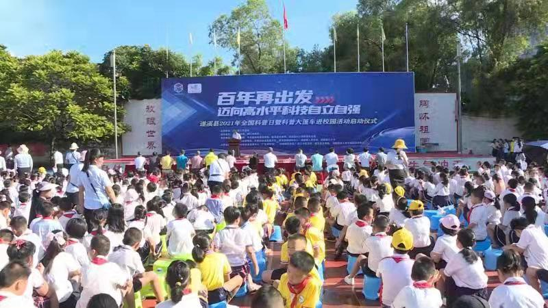 为在县内掀起开展2021年全国科普日活动的热潮及助推科普大篷车进校园活动顺利开展, 9月23日上午,遂溪县人民政府在遂城第九小学举行了遂溪县2021年全国科普日暨科普大篷车进校园活动启动仪式和主场活动。遂溪县人民政府副县长黄小平主持启动仪式,广东省科协事业发展中心副主任张碧华,湛江市科协党组书记、主席肖斌,中共遂溪县委常委、宣传部长刘喜出席启动仪式并作发言讲话。在主场活动中,广大师生除体验到科普大篷车带来的科普表演及体验项目外,还能参加中医药科普、中医技术、叶拓、显微镜观察、人体模型观察、编程机器人操作、3d打印笔操作等体验活动,观看火云掌incendio、法老之蛇、大象牙膏、火焰龙卷风、云现、爆米花、3D全息投影等科普秀表演,活动内容丰富,亮点多多,大家乐而忘返。当天上午,广东省青少年创作大赛十佳科技辅导员、佛山市禅城区东鄱小学冯斌老师为遂溪县中小学科学教师及科技辅导员带来了青少年科技创新教育专题辅导课,与他们分享交流科普教育的技巧与心得。