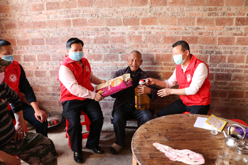 调研活动结束后,余飞兴、吴洪等同志在水月村开展“学雷锋”关爱困难群体志愿服务活动,慰问巫五金、陈信荣两户困难户代表。