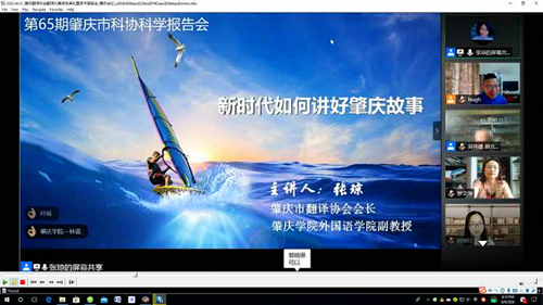 新时代,如何让世人认识当代中国?如何让国人增强“四个自信”?如何让外国了解中国、理解中国?6月7日下午,肇庆市科协在腾讯会议平台举办第65期科学报告会,本次报告会由市翻译协会承办,翻译协会会长张琼副教授作了“新时代如何讲好肇庆故事”报告,70名会员在线听取了学术报告。