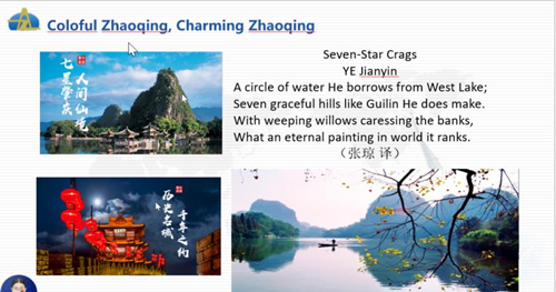 张琼紧跟习总书记提出的新时代主题,深入浅出地阐述如何讲好肇庆故事,鼓励翻译协会会员和青年学子为肇庆的对外文化宣传和经济发展多作贡献。张琼不仅翻译了叶剑英元帅和大文豪郭沫若的诗作,还就星湖奇观“卧佛含丹”创作了两首中英双语诗歌,极大地提高了与会观众的兴趣,会员和同学们频发赞赏表情。为提高会员和学生的翻译能力,张琼还从语篇视角,结合翻译竞赛,向会员细致讲解了翻译过程中的语篇解读、中英句子结构对比、选词措字以及如何表现语言韵律之美,与会人员纷纷表示受益匪浅。