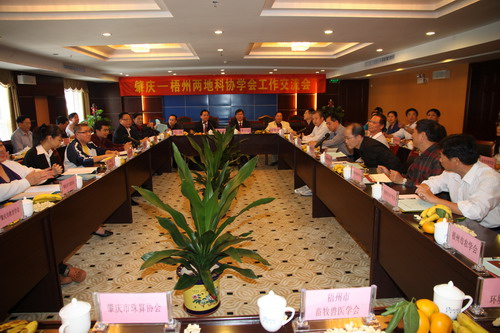 为深入学习贯彻十七届五中全会精神,促进肇庆、梧州两地科协交流与合作,推动两地科协工作创新发展,11月8日-9日,肇庆市、梧州市两地科协在梧州丽港大酒店隆重举行肇庆-梧州两地科协学会工作交流会。肇庆-梧州两地科协近60个学会负责人以及两地科协机关的同志参加了交流会。交流会由肇庆市科协党组书记、主席孔进棠主持。梧州市科协党组书记、主席李巧扬介绍了梧州市社会经济发展的基本情况以及梧州科协的工作情况,肇庆市科协副主席陈伟向参会人员传达了广东省科协学会工作会议精神。