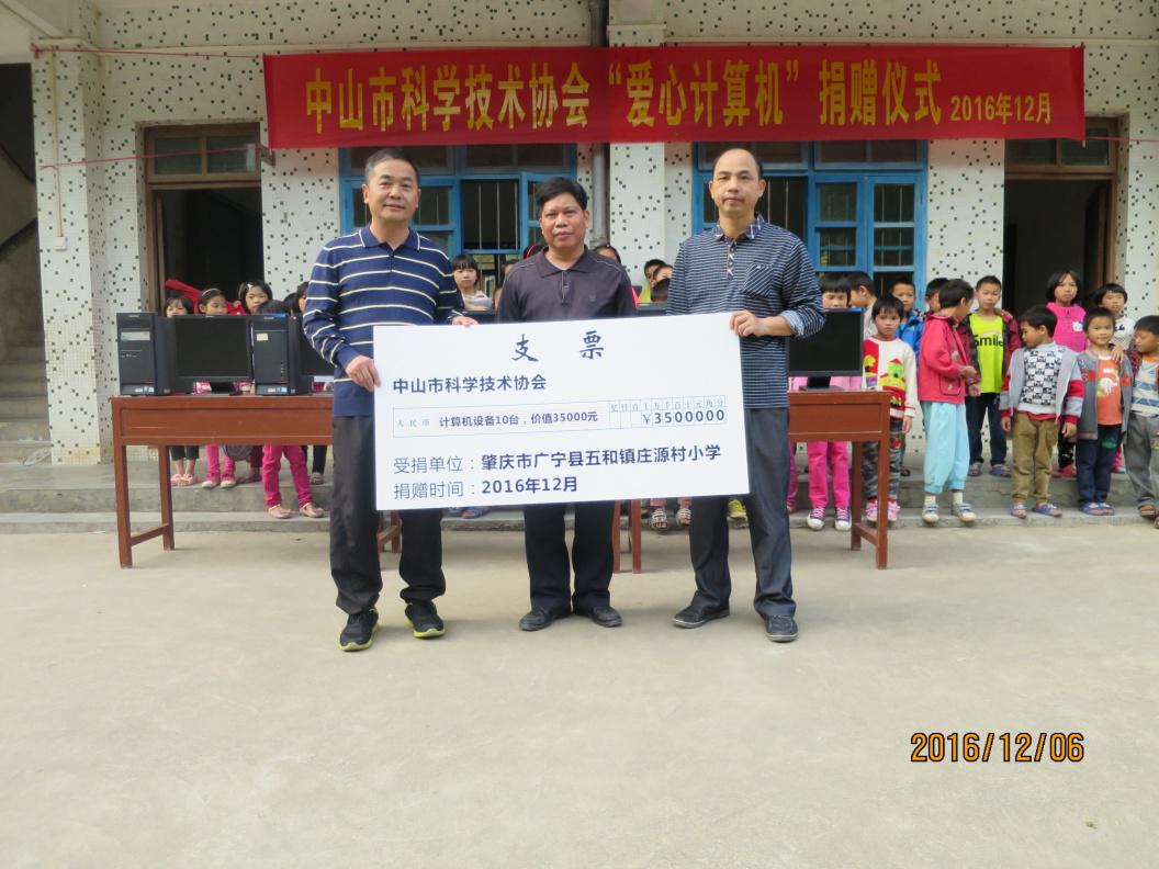 为积极践行“两学一做”专题学习教育要求,深入贯彻落实中山市新时期精准扶贫精准脱贫三年攻坚规划,确保扶贫帮扶工作的有效开展,在中山市扶贫办、中山市驻广宁县驻县工作组的领导组织下,在中山市驻庄源村联合工作组的协调统筹下,12月上旬,中山市科协组织开展扶贫对口帮扶村“暖冬行”系列活动。12月6日,中山市科协党组成员、副调研员、秘书长海春生带队到驻点的肇庆市庄源村开展志愿服务活动,组织农业和劳动技能方面专家到村开展产业精准对接和专题培训,并代表驻村组向庄源村小学捐赠爱心计算机。五和镇镇长罗振华,中山市驻庄源村扶贫工作组组长邓海煌及全体驻村工作人员、村“两委”干部等参加活动。