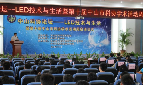 第十届中山市科协学术活动周启动仪式于11月4日下午在中山火炬职业技术学院举行。中山市科协党组副书记、副主席余元龙到会致辞并宣布第十届中山市科协学术活动周启动,市科协副主席陈旭东主持启动仪式,市科协调研员蔡泽强,中山火炬职业技术学院党委副书记、常务副院长王春旭,中山火炬职业技术学院副院长,中山市光学会副理事长黄俊斌等领导出席了启动仪式。启动仪式之后,举办了学术活动周首场学术活动《中山科协论坛——LED技术与生活》。论坛由中山市科学技术协会主办,中山市光学学会承办,中山火炬开发区科协、中山火炬职业技术学院协办。中山市光学学会秘书长马跃新主持论坛。论坛邀请到了华南理工大学博士生导师文尚胜教授做题为“LED技术与生活”的学术报告。市级各学会(研究会、协会)理事长、秘书长,镇区科协负责人,市部分高新技术企业代表,以及市科协、市光学会、中山火炬职业技术学院部分师生等相关单位代表,共计200余人参加了活动。