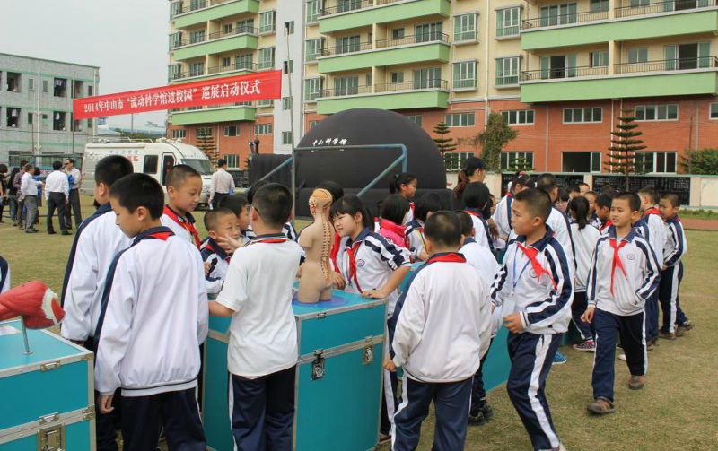 “流动科学馆进校园”巡展活动由中山市科协主办,中山科学馆承办,是一项让广大城乡青少年学生共享科普资源的常年性巡展活动,也是市科协、中山科学馆走基层、转作风而推出的“科普活动进基层”系列活动项目之一,它让科普展览搭乘“科普大篷车”直接开到校园,让广大师生在校园就可享受丰富的科普精神大餐。“流动科学馆”巡展主要内容有移动式球幕影院展演、动手动脑的“声光电”科普展品展览、科普知识展板展览、多媒体科普知识短片放映等。巡展活动由各中小学校预约,市科协根据预约安排,一般每校展出一周,整个活动暂定一年,以后将根据广大青少年学生的需求,适时推出更多、更好的展览项目。
