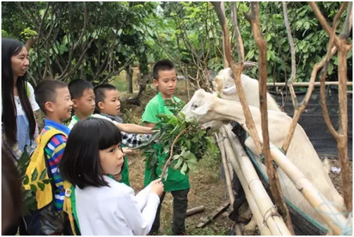 图为小朋友们喂养山羊