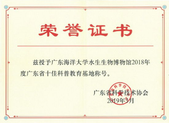 广东海洋大学水生生物博物馆获评“2018年度广东省十佳科普教育基地”