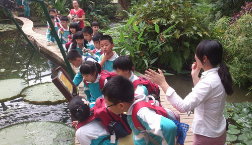 华南植物园“花世界的魔法”自然科普课堂,同学们在观察王莲的形态。