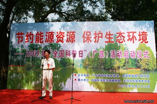 为了进一步贯彻实施《全民科学素质行动计划纲要》,提高全民科学素质,9月22日,由广东省科学技术协会、中国科学院广州分院主办,中国科学院华南植物园、天河区科学技术协会承办的以“节约能源资源 保护生态环境”为主题的2007年全国科普日(广东)启动仪式在华南植物园举行。