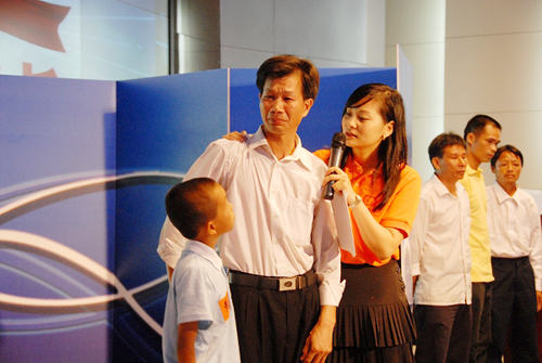 在主办单位的帮助下,广西留守少儿终于与在广东打工的父母见面。10岁男孩黄上英一见到爸爸,就扑上去紧紧抱着爸爸,父子俩相拥而泣。11岁的叶耀林抱着一个硕大的木菠萝,走到爸爸叶祚成面前,已经泣不成声。望着儿子怀里从家乡带来的沉甸甸的“礼物”,叶祚成再也控制不住,双手掩面跑下台……这一幕幕感人场景,感动了现场所有的人们,催人泪下。