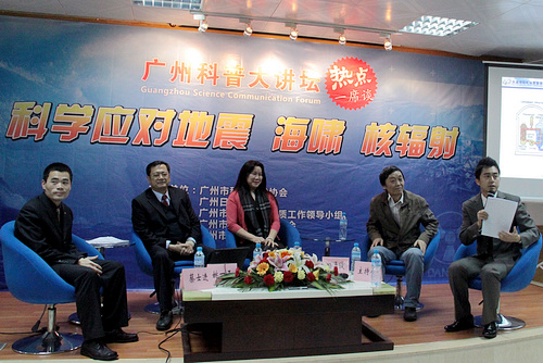 2011年3月22日,2011广州科普大讲坛之“热点一席谈”活动吸引了当地数十家新闻媒体和数百名广州公众的现场热情参与,来自广东省地震预报研究中心主任杨马陵、中科院南海海洋研究所研究员唐丹玲、大亚湾核电运营管理有限责任公司高级工程师姚一正以及中山大学理工学院副教授蔡杰进与媒体、市民面对面,就日本大地震所带来的市民对地震、海啸、核辐射等问题的疑问为市民答疑解惑。活动由广州市科协、广州市全民科学素质行动计划纲要办公室、广州日报社联合主办,广州市科学技术中心承办。