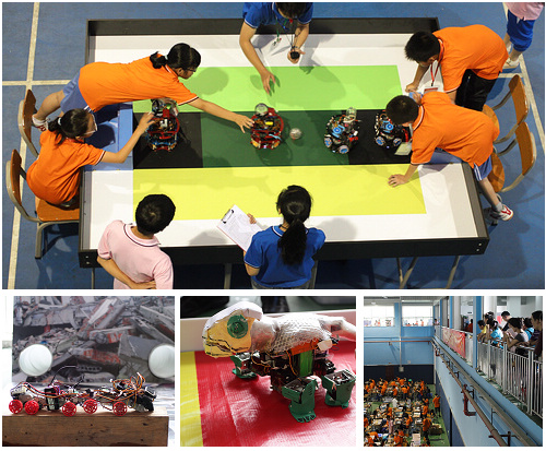 机器人足球对抗、VEX工程挑战、沙滩“清洁工”、地震蛇形救援机器人、会变色会喷水的机器变色龙……一年一度检阅我省广大青少年机器人爱好者竞技水平的一次科技盛会——第12届广东省青少年机器人竞赛,2012年5月12日上午在广州大学附属中学大学城校区开幕。全省13个地市241支参赛队,850名选手参加了本届竞赛,活动规模之大、规格之高、参赛人数之多,均创下了历届之最。