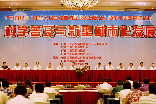 近日,由广州市人大教科文卫工委、广州市科协、广州市科信局、广州市社科联联合举办的“广州市纪念《科普法》颁布十周年高端论坛” 在广州举行,中国科协原副主席徐善衍,中国工程院院士刘人怀,中国科普研究所所长任福君,上海市科学学研究会会长、上海科学普及促进中心主任李健民,广东科学中心主任王可炜等国内知名科普专家在论坛上畅所欲言,为正在走新型城市化道路的广州提升市民科学素质出谋献策。