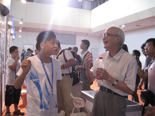 佛山市禅城区东鄱小学苏思元同学在为中国科学院黎乐明院士介绍项目