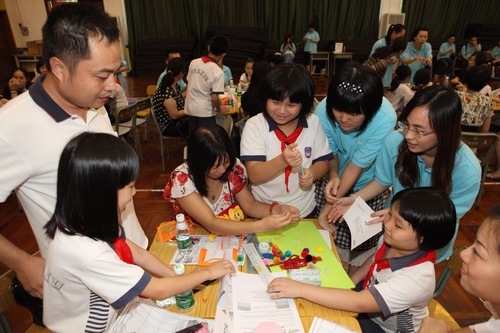 广州市朝天小学的家长和学生参加学校组织的家庭科技教育活动