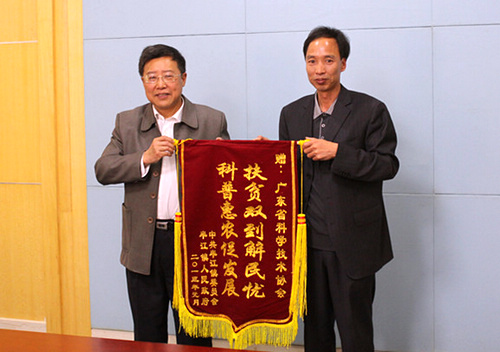 座谈会上,半江镇镇委副书记肖衍钦同志也作了发言,宣读了“樟溪村致广东省科协的感谢信”,信中指出:广东省科协“双到”扶贫工作重“输血”更重“造血”,帮助樟溪村建立健全了生产发展长效机制,帮扶樟溪村在发展与保护相统一的生态文明下发展集体经济,如农副产品运输、竹子加工、蜜蜂养殖等帮扶项目成效显著,惠及全民,全村78户贫困户全部脱贫致富。半江镇委、镇政府和樟溪村两委还分别给省科协送上锦旗:“扶贫双到解民忧,科普惠农促发展”;“情系樟溪,真心帮扶”。