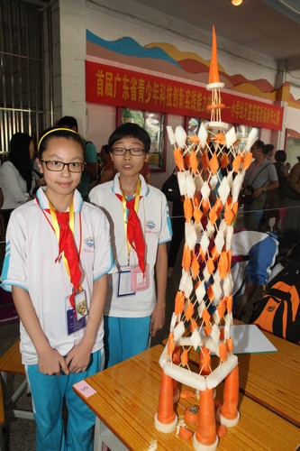 汕头市第一中学高三学生郭家键和吴晓康制作的只有16.6克重的三角支撑纸承重模型,却能把7箱65.71公斤的矿泉水支撑起来,承重量位居35支队伍之首,惊呆全场,观众掌声一片。初中和小学的选手们2人一组,分工协作,小刀手起手落,将土豆、萝卜切成各种形状,然后用牙签搭出近一米高的“小蛮腰”广州塔、艾菲尔铁塔等塔状建筑,千姿百态,栩栩如生!