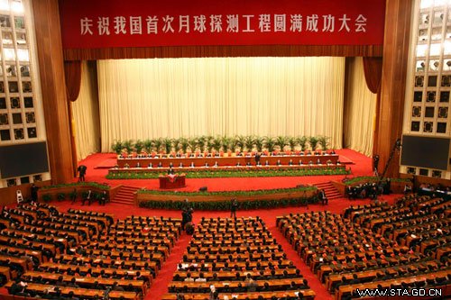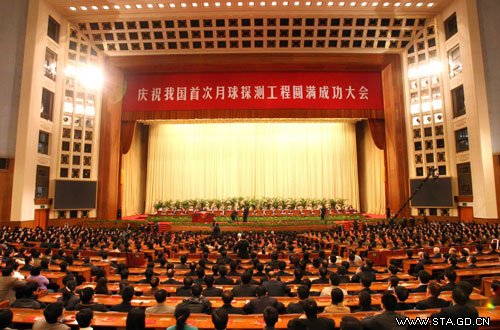 中共中央、国务院和中央军委12日上午在人民大会堂举行大会,隆重庆祝我国首次月球探测工程圆满成功。中共中央总书记、国家主席、中央军委主席胡锦涛发表重要讲话。