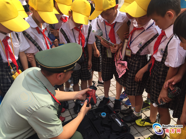 参加活动的学生们在消防员的指引下体验消防器械。