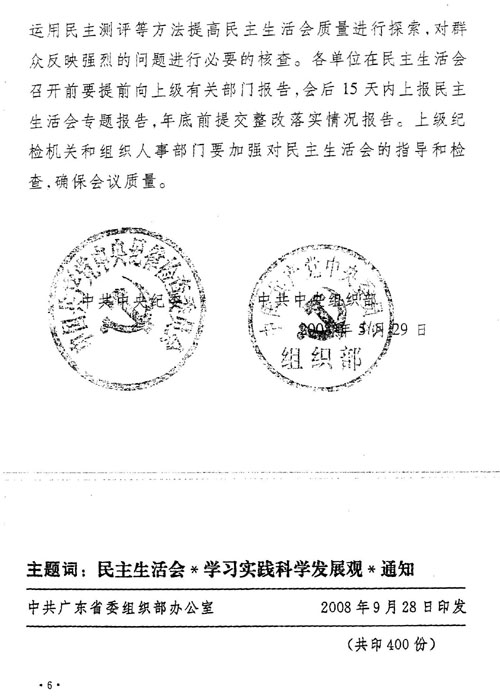 二、根据省纪委、省委组织部《转发中共中央纪委中共中央组织部关于以“学习和实践科学发展观”为主题开好县以上党和国家机关党员领导干部民主生活会的通知》(粤组通[2008]60号)的精神和省科协的工作安排,2008年度省科协直属机关副处以上党员领导干部民主生活会定于今年12月上旬举行,安排在学习实践活动的分析检查阶段进行,与学习实践活动的专题民主生活会合并召开。省科协党组民主生活会由党组书记召集和主持,省科协党组各成员参加会议。各直属单位和机关各部室党员领导干部民主生活会由本单位、本部室党支部书记召集和主持,所在单位、部室党员干部参加会议。广东工职院领导班子的民主生活会由党委负责人召集和主持,领导班子成员参加会议;各党支部领导干部民主生活会由党支部召集和主持,党支部党员干部参加会议。
