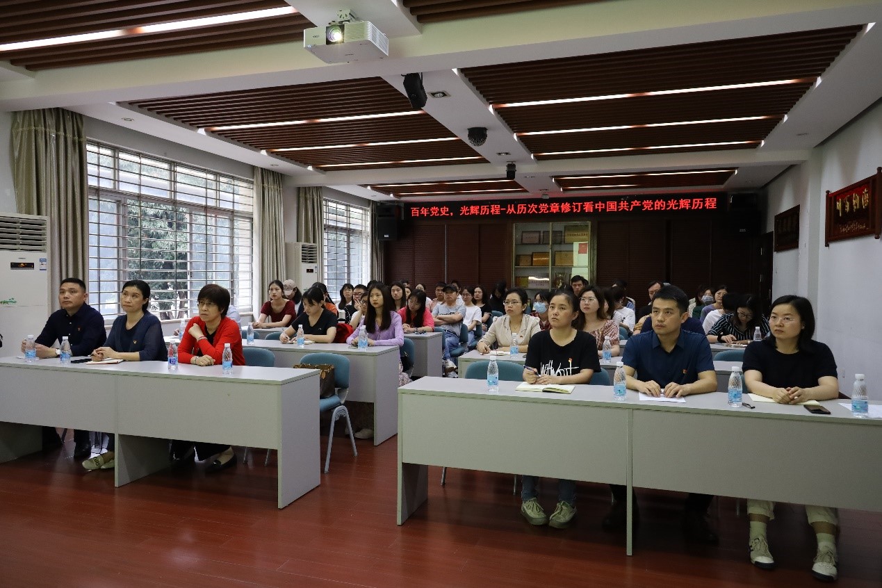 刘教授以百年党史为主线,由党章的历次修订为切入点,从党纲和党章、党的创立以及光辉历程三个方面着手,用大量生动的人物故事和党史案例,回顾了100年来中国共产党团结带领人民走过的光辉历程及取得的辉煌成就。重点讲述从中共二大制定了第一部正式党章到党的十九大, 中国共产党先后17次修改了党章,剖析每次党章修改的主要内容和历史背景。刘教授强调,党章是党的总章程,集中体现了党的性质和宗旨、党的理论和路线方针政策、党的重要主张,规定了党的重要制度和体制机制,是全党必须共同遵守的根本行为规范,对推进党的工作,加强党的建设,具有根本性的规范和指导作用,每次对党章的修改和完善都反映了党对自身建设规律进行探索的情况,都记录着党的发展进程。
