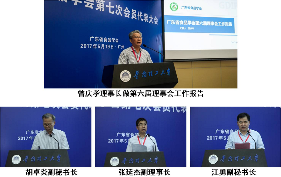 按照会议议程安排,曾庆孝理事长代表第六届理事会作“工作报告”,胡卓炎副秘书长“第六届理事会财务审计情况报告”,张延杰副理事长介绍了“学会章程修改草案”,汪勇副秘书长宣读“第七届理事会选举办法”。曾理事长的报告总结了广东省食品学会在学术交流、会员服务、承接政府转移职能、科普宣传等多方面进行的工作和取得的成绩。学会以学术交流为载体,引领学科发展,促进自主创新,推动我省食品科技进步。学会每年根据国家、广东省食品产业、社会经济发展形势等,围绕食品学科及产业发展中的重要问题,精心组织学术研讨与学术年会。五年来,学会主持、主办、承(协)办的学术研讨会、专题报告会共18场,参加人数5300余人,组织专家学术报告60人次,交流学术论文227篇,出版论文专集5本。近年学会编撰的科普宣传资料向省内8个专题会议(活动)、16个地级市科协、食品学(协))、10多间中小学派送,受益人数近6万人,惠及食品企业和相关单位近3千多家。学会先后承接了多项广东省地方安全标准编制工作,组织专家编写了食品质量安全相关培训教材和科普读物,密切关注行业领域内具有全局性、前瞻性和紧迫性的热点问题,通过科普宣讲等形式为普通民众答疑解惑,向相关政府主管部门提交专家建言供决策参考。2011年获中国科学技术协会授予“ 全国科协系统先进集体”称号,中国食品科学技术学会授予“先进集体”称号;2013年和2015年获广东省科协“省级学会先进集体”荣誉称号;2012年、2014年和2016年连续获广东省科协授予“创建学会科技服务站先进单位”称号;2015年被中国食品科学技术学会评为2014年度优秀地方食品学会。2016年被中国食品科学技术学会授予“2011~2016年度先进集体奖”。