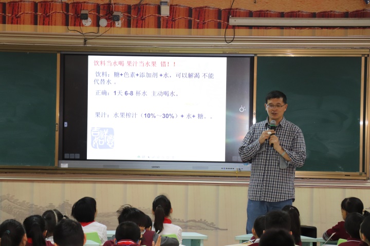 张老师根据小学生生长发育特点和特殊的营养需要,告诉孩子们如何科学、合理地安排一日三餐。在讲到孩子们最喜欢的零食时,张老师表示,小学生营养需要量大,胃肠的消化能力强,未到主餐时间饿了可以适当吃些如花生、核桃、蚕豆等含丰富的蛋白质、不饱和脂肪酸、维生素和矿物质的小食品,补充人体的需要,对健康有利。