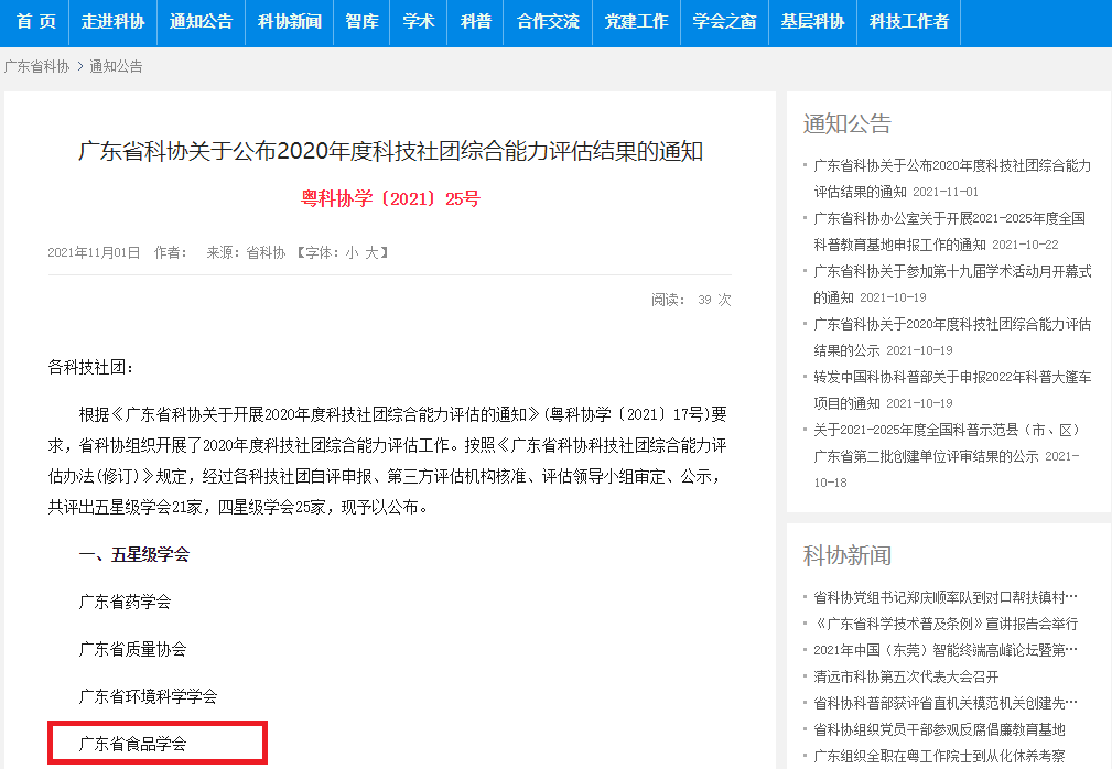 近日,广东省科学技术协会公布了《广东省科协关于2020年度科技社团综合能力评估结果》,广东省食品学会再获“五星级学会”称号。据了解,本次共有127家科技社团参加综合能力评估。经自评申报、第三方评估机构核准、评估领导小组审定,共评出五星级学会21家,四星级学会25家。