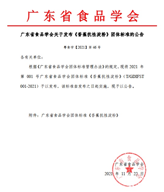 根据《广东省食品学会团体标准管理办法》的有关规定,由学会标准化技术委员会及相关专家审核,经标准提案、审核立项、标准起草、征求意见、专家审查、审批发布,广东省食品学会团体标准《香蕉抗性淀粉》(T/GDIFST 001-2021)于2021年11月22日正式发布,该标准自发布之日起实施。