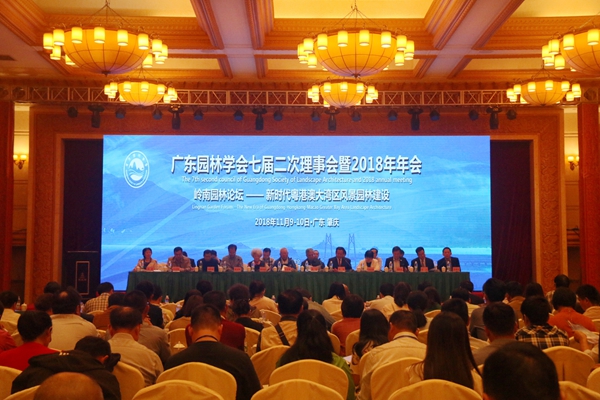 2018年11月9—10日,广东园林学会七届二次理事会及2018年年会暨岭南园林论坛在肇庆召开。本次年会由广东园林学会主办,肇庆新区管理委员会、肇庆风景园林学会协办。广东园林学会第七届理事会理事、顾问、各会员单位和各专业委员会代表、个人会员及肇庆市有关园林绿化单位代表等约300人参加了会议。