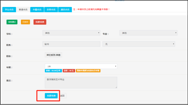 4、点击“我要续费”后,查看自己的资料是否有误或更新,完善个人信息,下拉到最后点击“我要续费”,提交续费订单,可以修改会员年限等信息,如果未到期会员续费,直接续费不需要审核,已到期会员,需要重新审核。