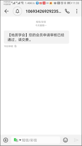 6、如果是新注册的请等待管理员审核通过,收到下面的缴费短信后再进行缴费。