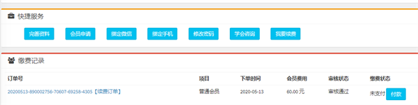 注:续费缴费可以在会员提交界面看到也可以在首页订单区看到。