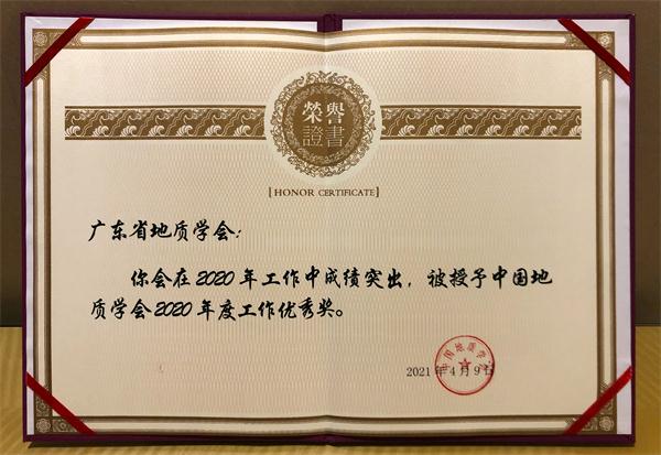广东省地质学会被授予中国地质学会2020年度工作优秀奖