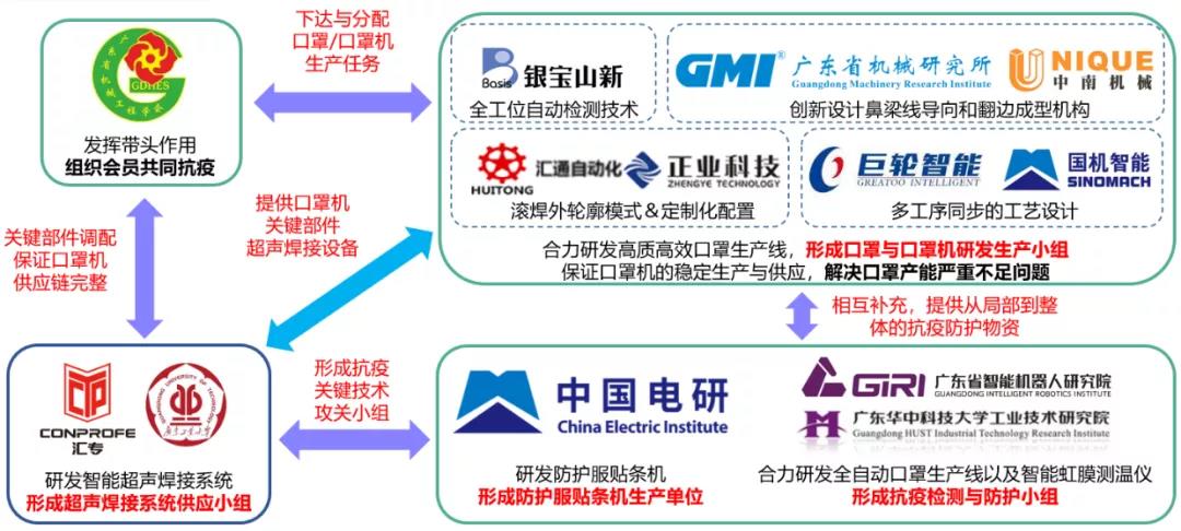 在疫情的2月至5月关键时期,面对突然其来的医疗防护制品制造装备的巨大需求,广东省机械工程学会果断在对会员企业中整机、关键功能部件、控制技术等几个方面的企业进行整合联动,调动院校的专家委员会专家亲自到企业第一线指导企业的创新开发起到积极作用,解决了大规模生产下医疗防护制品制造装备紧缺、自动化程度低、缺少监控系统、生产稳定性差等问题。针对高质高效医疗防护制品制造关键技术与装备及产业化应用,本项目开发医疗防护制品生产专用快速传输单元,开发医疗防护品生产专用高效超声焊接及热合单元,开发了医疗防护制品生产线全工位自动测控单元,研发的医疗防护制品制造关键技术与装备形成批量制造产业化应用,使这些原来不是口罩机制造的企业成功转型为全自动口罩机的成功制造商。