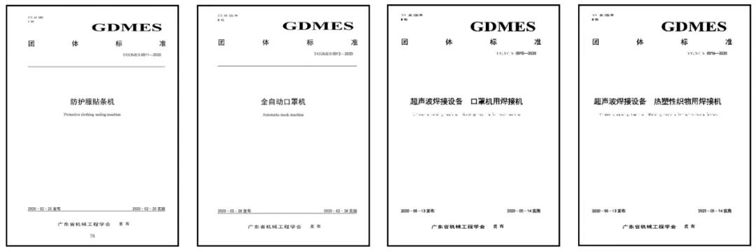 针对防护服贴条机及口罩机和超声波焊接机产品等生产制造过程中当前还没有对应的国内外医疗防护制品装备制造标准,缺乏统一的科学评价要求,引起其制造装备的质量水平参差不齐等瓶颈和问题,广东省机械工程学会标准化工作委员会充分发挥团体标准的高度和指导作用, 2020年2月25日在国内率先组织研制发布了第一个GDMES《防护服贴条机》团体标准;2020年2月29日在国内率先组织研制发布了第一个GDMES《全自动口罩机》团体标准;2020年4月30日在国内率先组织研制制定了第一个GDMES《超声波焊接设备 热塑性织物用焊接机》团体标准及第一个GDMES《超声波焊接设备 口罩机用焊接机》团体标准。在抗疫的关键时刻,在全国同行率先制定这4项医疗产品制造装备研制标准过程中,本项目口罩机、贴条及超声波焊接设备等开发制造单位积极参与,真正做到制造装备有高度与先行,为提升制造质量、规范行业发展、确保医护人员安全发挥重要作用。通过将科研成果标准化,研制团体标准,以标准在前为切入点,有力指导企业按标准生产,推动了行业的技术进步,保证了制造装备和医疗防护产品的质量。