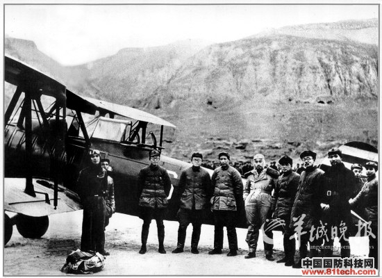 1936年12月,西安事变中周恩来担任调停任务,从延安到西安来回都是乘坐由国民政府免费安排的“复兴”号飞机。周恩来(左6)穿上了新买的皮鞋,生平第一次坐上了飞机。回到延安后一下飞机就拉着毛泽东(左5)等同志在“复兴”号飞机前合影。